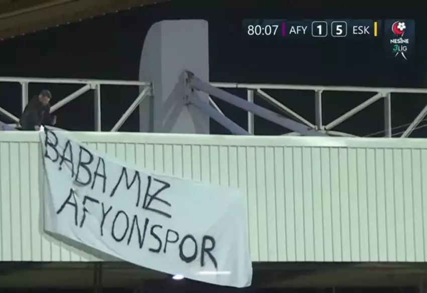 Maçın 80. dakikasında Afyonspor tribünlerinde açılan bir pankart, tansiyonu bir anda yükseltti. Üzerinde “Babamız Afyonspor” yazısı bulunan pankart, Eskişehirspor taraftarlarının büyük tepkisine yol açtı. Siyah-kırmızılı taraftarlar, karşılaşma devam ederken tribünlerdeki filelere tırmanarak pankartı kendi elleriyle kaldırdı.