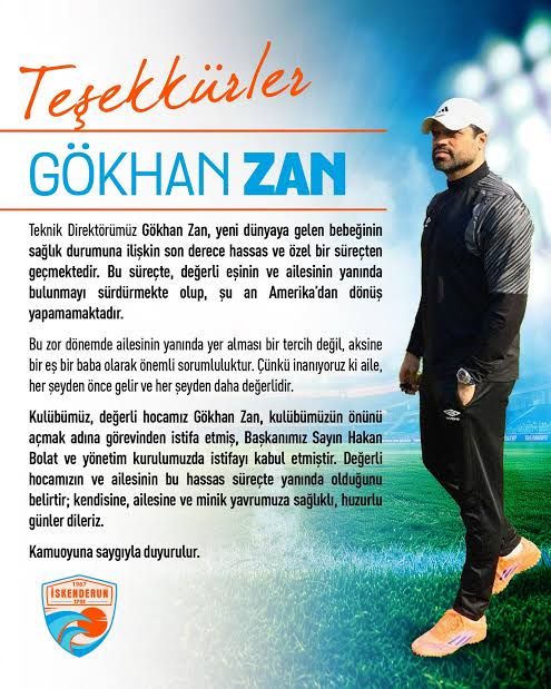Zan'ın, bu süreçte ailesinin yanında olacağı belirtilen açıklamada "Bu zor dönemde ailesinin yanında yer alması bir tercih değil aksine bir eş bir baba olarak önemli sorumluluktur çünkü inanıyoruz ki aile, her şeyden önce gelir ve her şeyden daha değerlidir. Değerli hocamız Gökhan Zan, kulübümüzün önünü açmak adına görevinden istifa etmiştir. Başkanı'mız Sayın Hakan Bolat ve yönetim kurulumuz da istifayı kabul etmiştir. Değerli hocamızın ve ailesinin bu hassas süreçte yanında olduğunu belirtir kendisine, ailesine ve minik yavrumuza sağlıklı, huzurlu günler dileriz." ifadelerine yer
