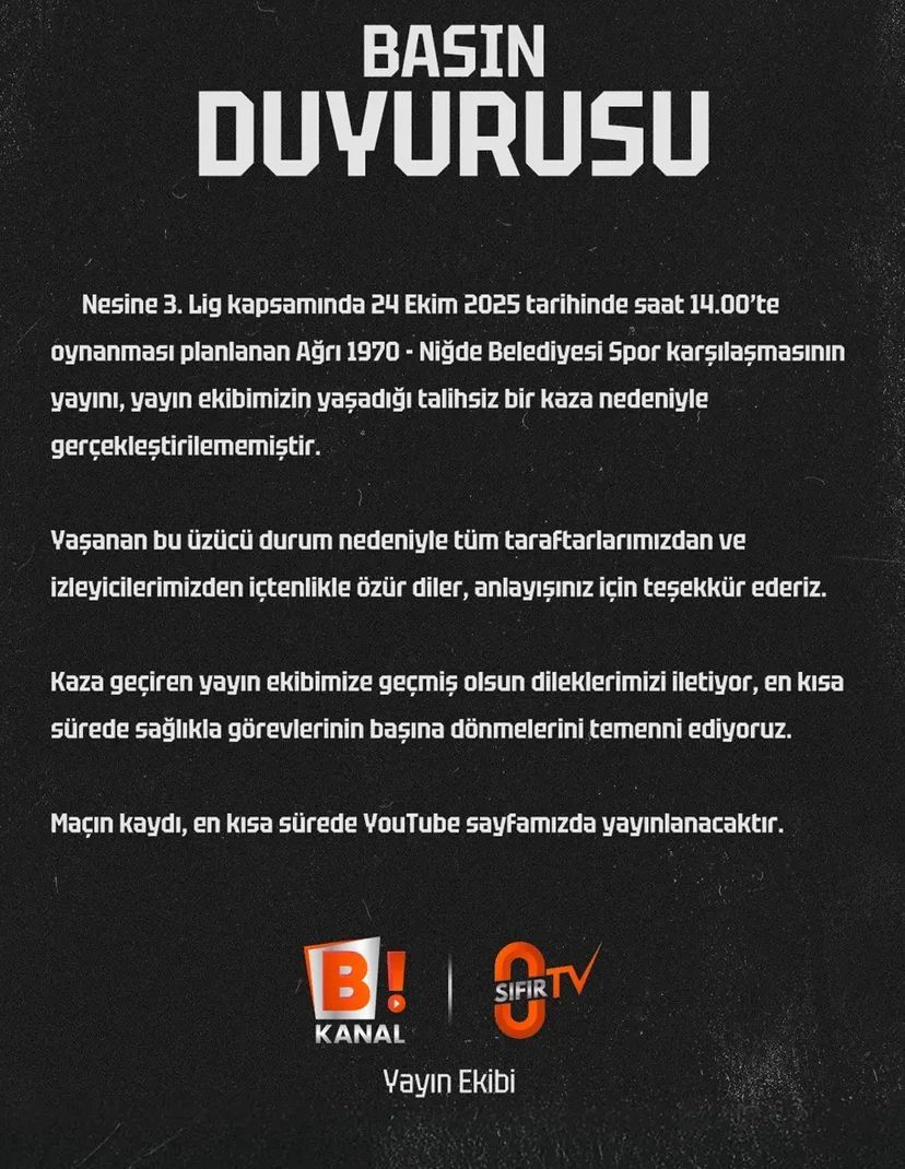 "Nesine 3. Lig kapsamında 24 Ekim 2025 tarihinde saat 14.00'te oynanması planlanan Ağrı 1970 - Niğde Belediyesi Spor karşılaşmasının yayını, yayın ekibimizin yaşadığı talihsiz bir kaza nedeniyle gerçekleştirilememiştir.