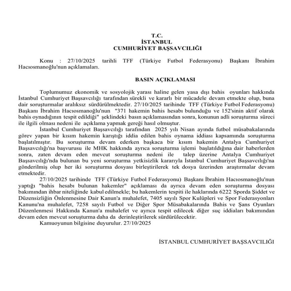 "Toplumumuz ekonomik ve sosyolojik yarası haline gelen yasa dışı bahis oyunları hakkında İstanbul Cumhuriyet Başsavcılığı tarafından sürekli ve kararlı bir mücadele devam etmekte olup, buna dair soruşturmalar aralıksız sürdürülmektedir. 27/10/2025 tarihinde TFF (Türkiye Futbol Federasyonu) Başkanı İbrahim Hacıosmanoğlu'nun "371 hakemin bahis hesabı bulunduğu ve 152'sinin aktif olarak bahis oynadığının tespit edildiği" şeklindeki basın açıklamasından sonra, konunun adli soruşturma süreci ile ilgili olması nedeni ile açıklama yapmak gereği hasıl olmuştur.